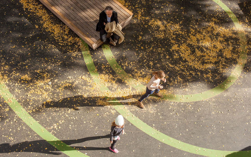 Die langen Bänke und Holzdecks fassen die durch die schräge Bänderung entstandenen Aufweitungen, wodurch unterschiedliche kleinräumlichen Konstellationen mit hoher Aufenthaltsqualität entstehen.
