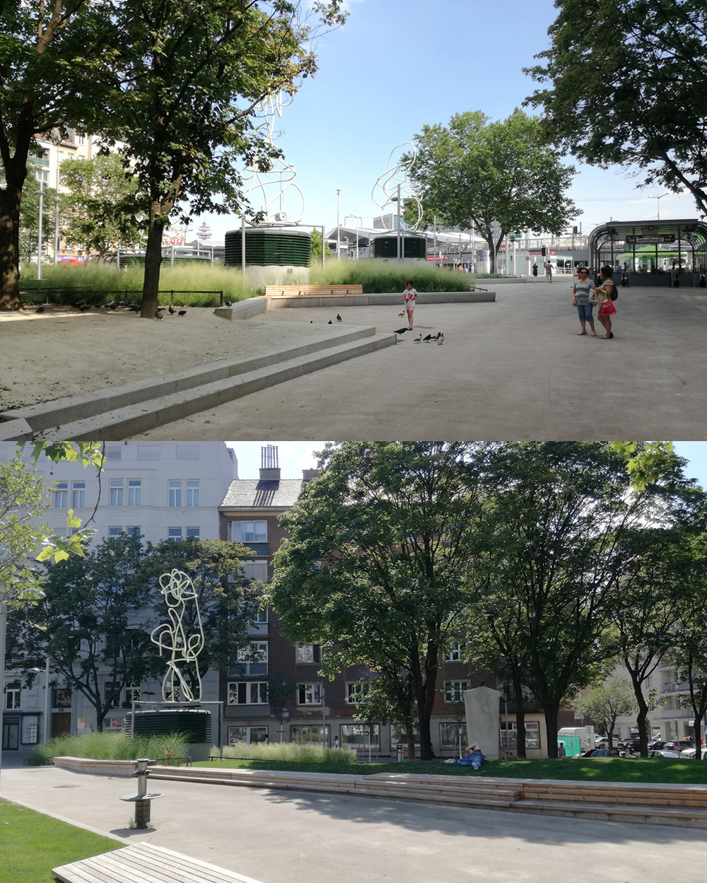 Transversale - eine neue diagonale Wegrelation mit wegbegleitenden Spielmöglichkeiten und ein verkehrsberuhigter Bereich in der Schelleingasse erweitern Nutzungsmöglichkeiten und Aufenthaltsqualität des Ortes. Hauptweg und Nebenwege - über den Lüftungsbauwerken der U Bahn sitzen Leuchtskulpturen, die einen formalen und inhaltlichen Rahmen über den Platz spannen. Sie verarbeiten das Thema Wege, Wegrouten und Reiserouten und tragen zur Identitätsbildung bei.